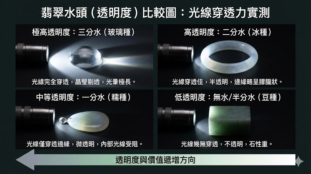 透明度檢測: 觀察光線是否能穿透玉體,透光度越好、光暈越強,代表水頭越足。