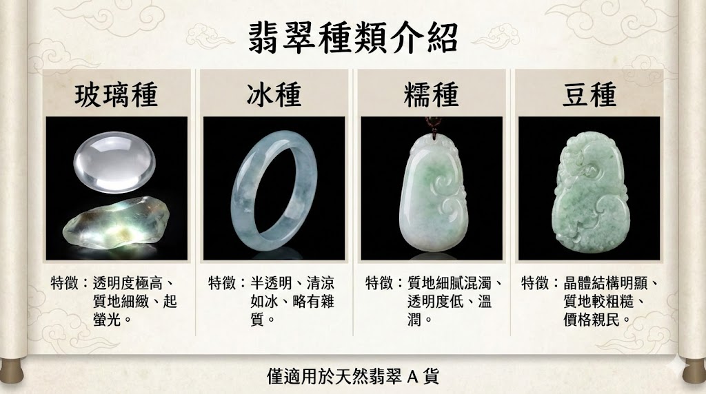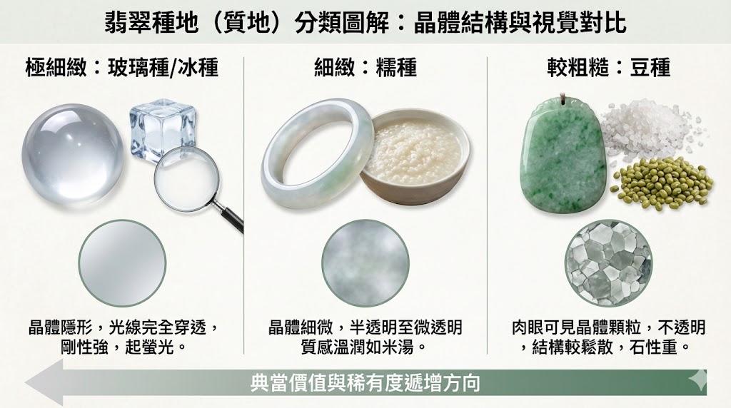 「種地」是指翡翠內部晶體顆粒的細緻程度,這是判斷翡翠品質的基礎指標,質地越細膩,代表內部的晶體結構越緊密,價值也就越高,在鑑別時,通常會觀察以下特徵: