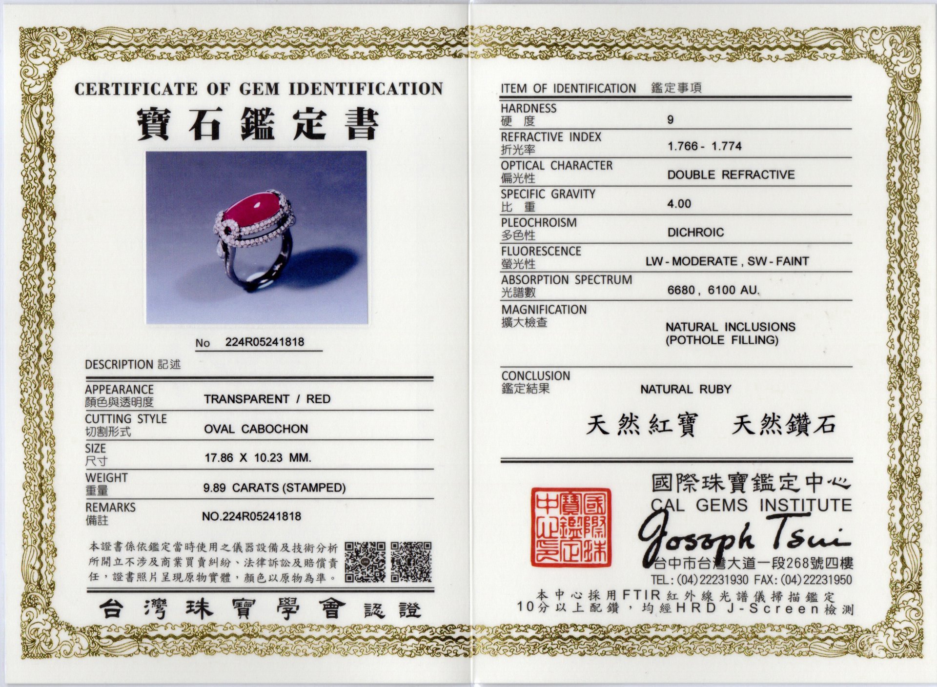 亞瑟寶石鑑定書(開新視窗)