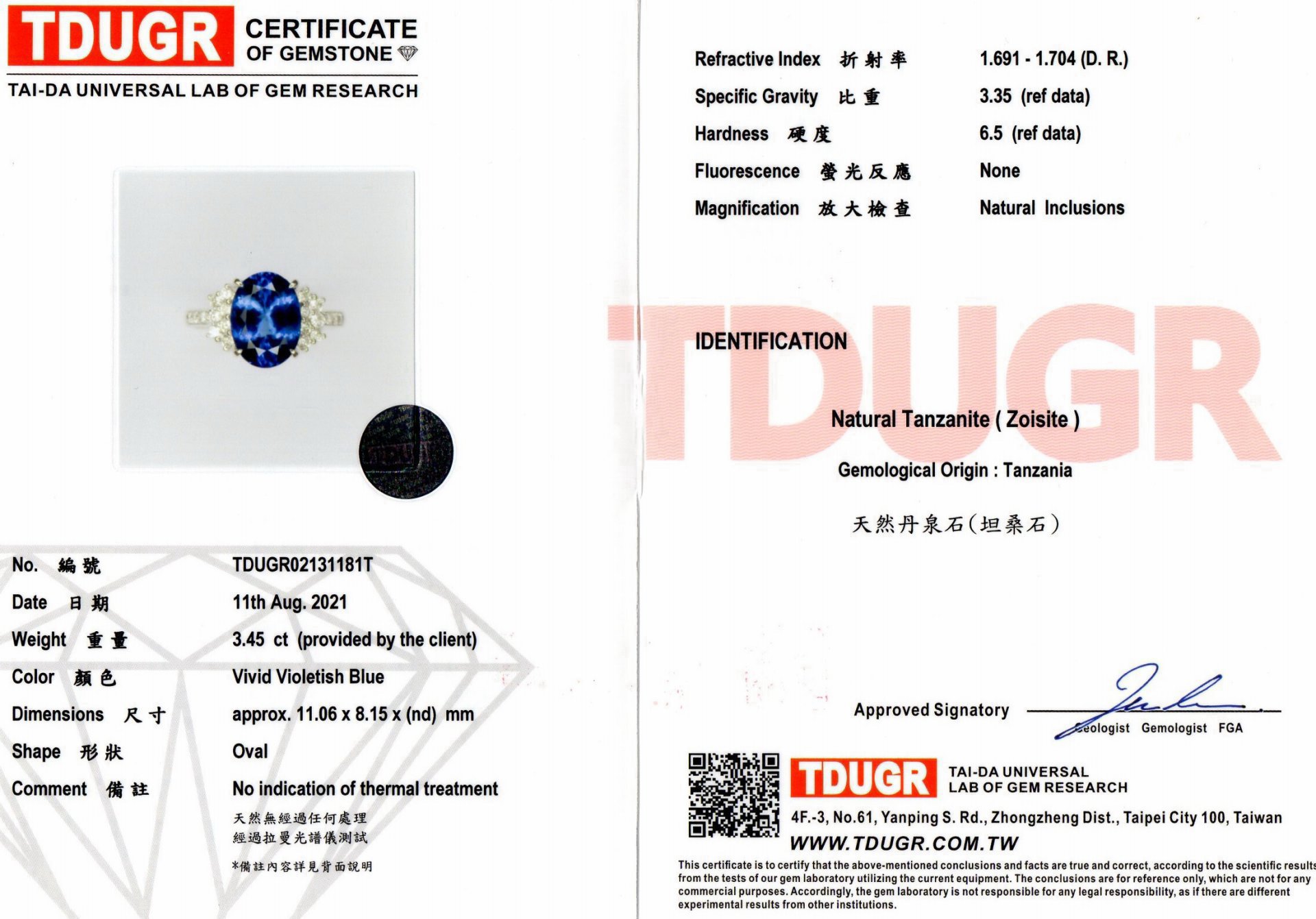 亞瑟寶石鑑定書(開新視窗)