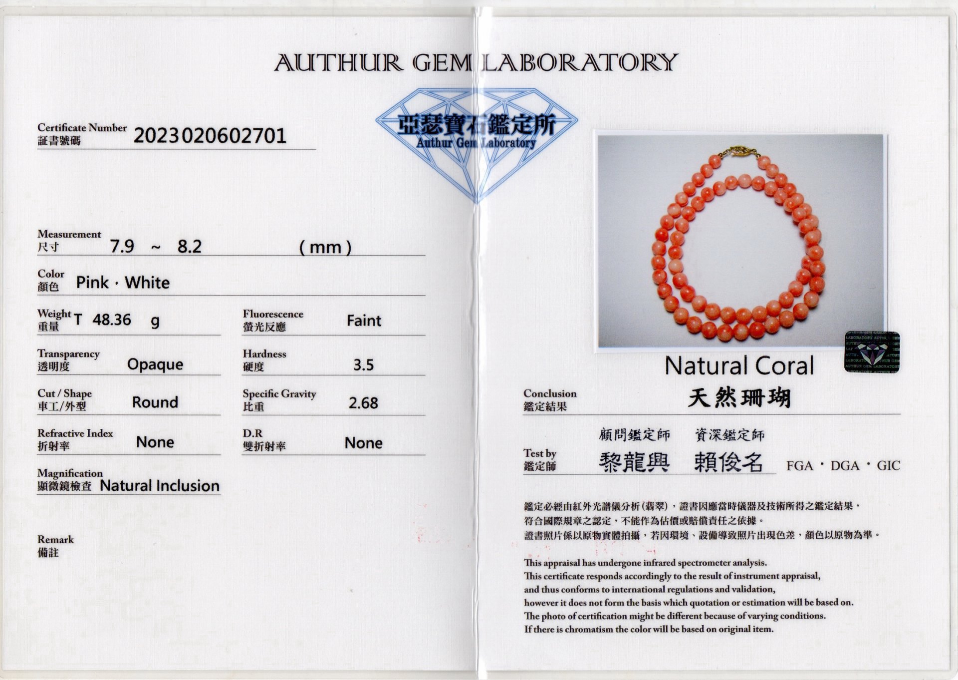 亞瑟寶石鑑定書(開新視窗)