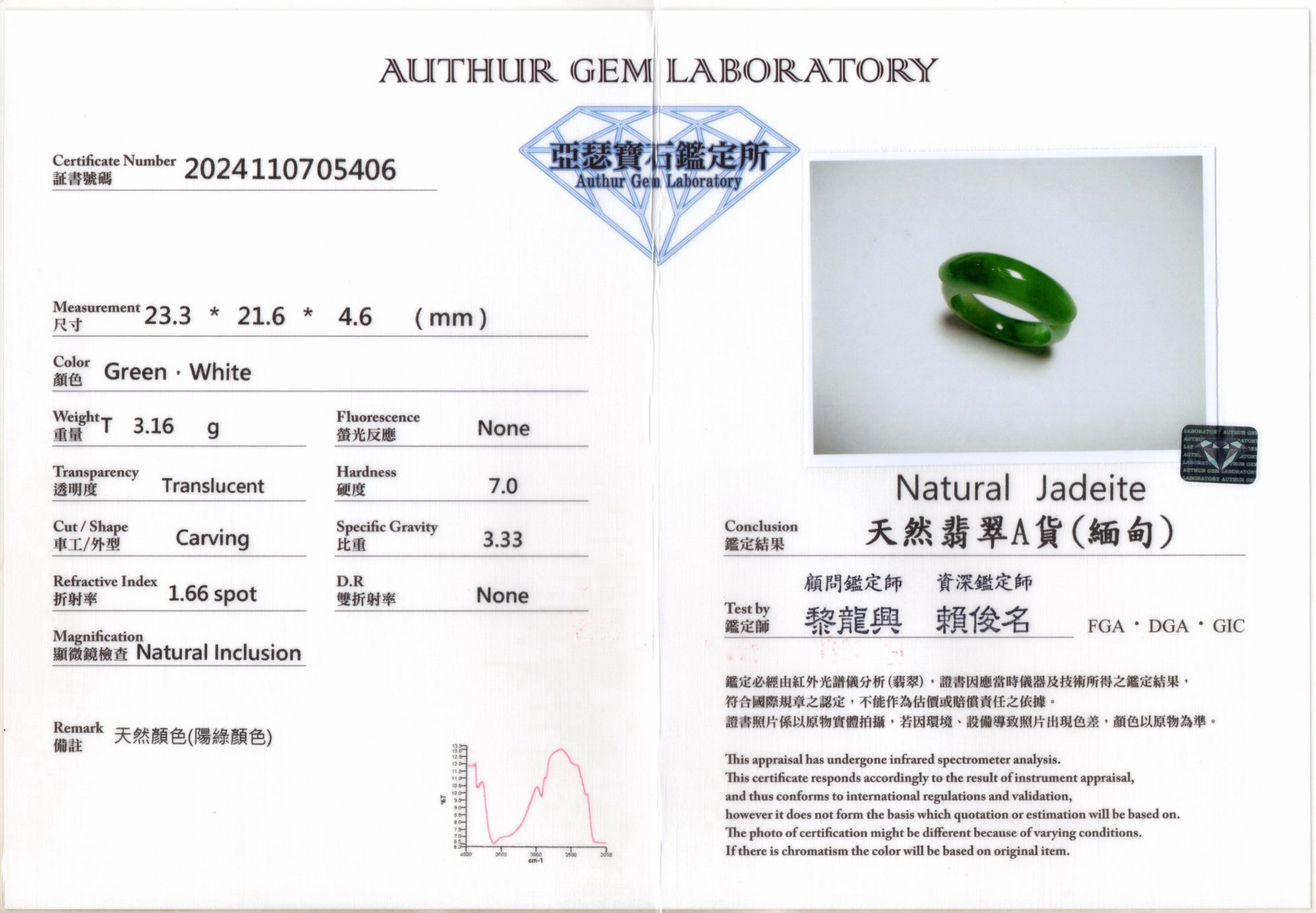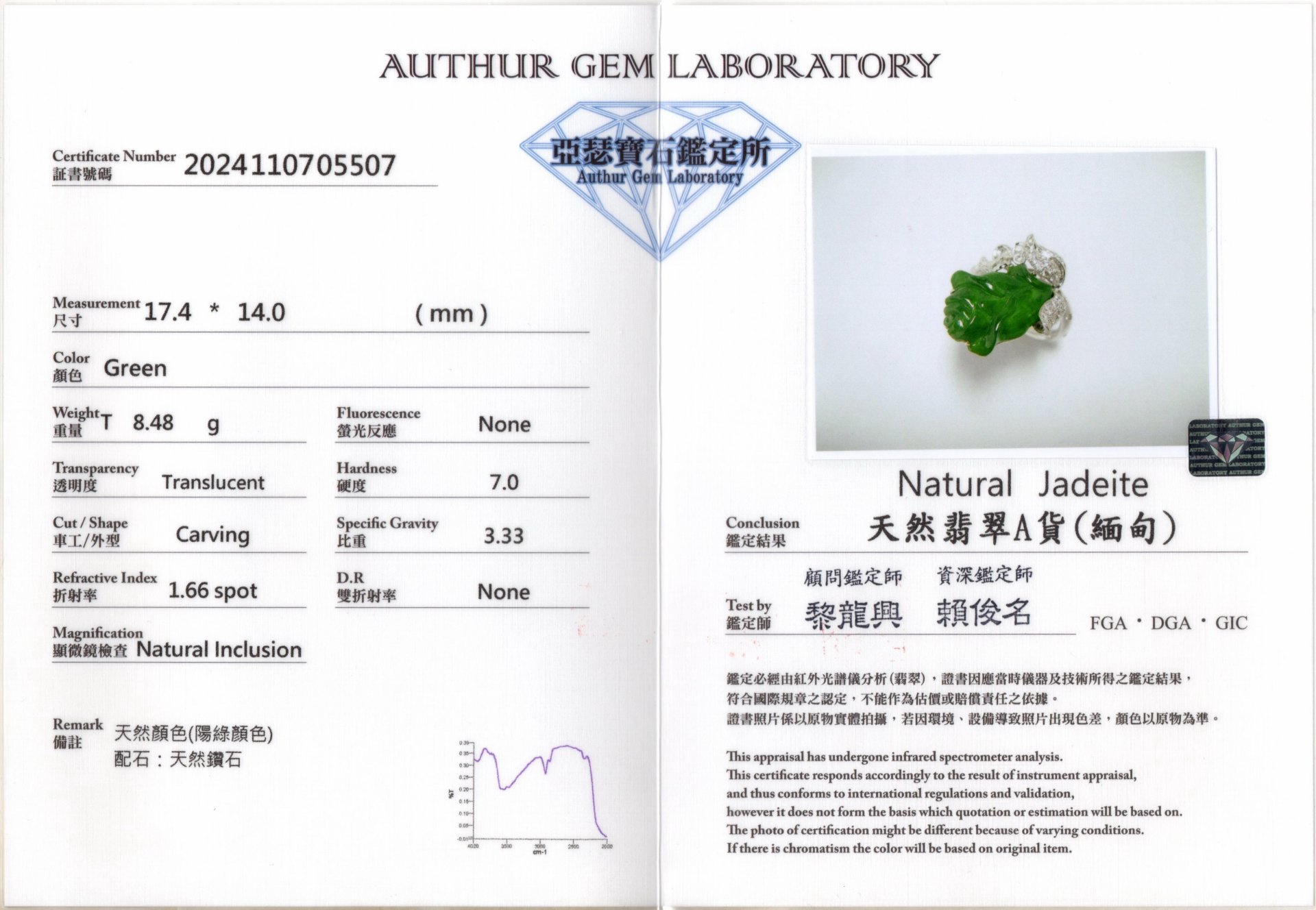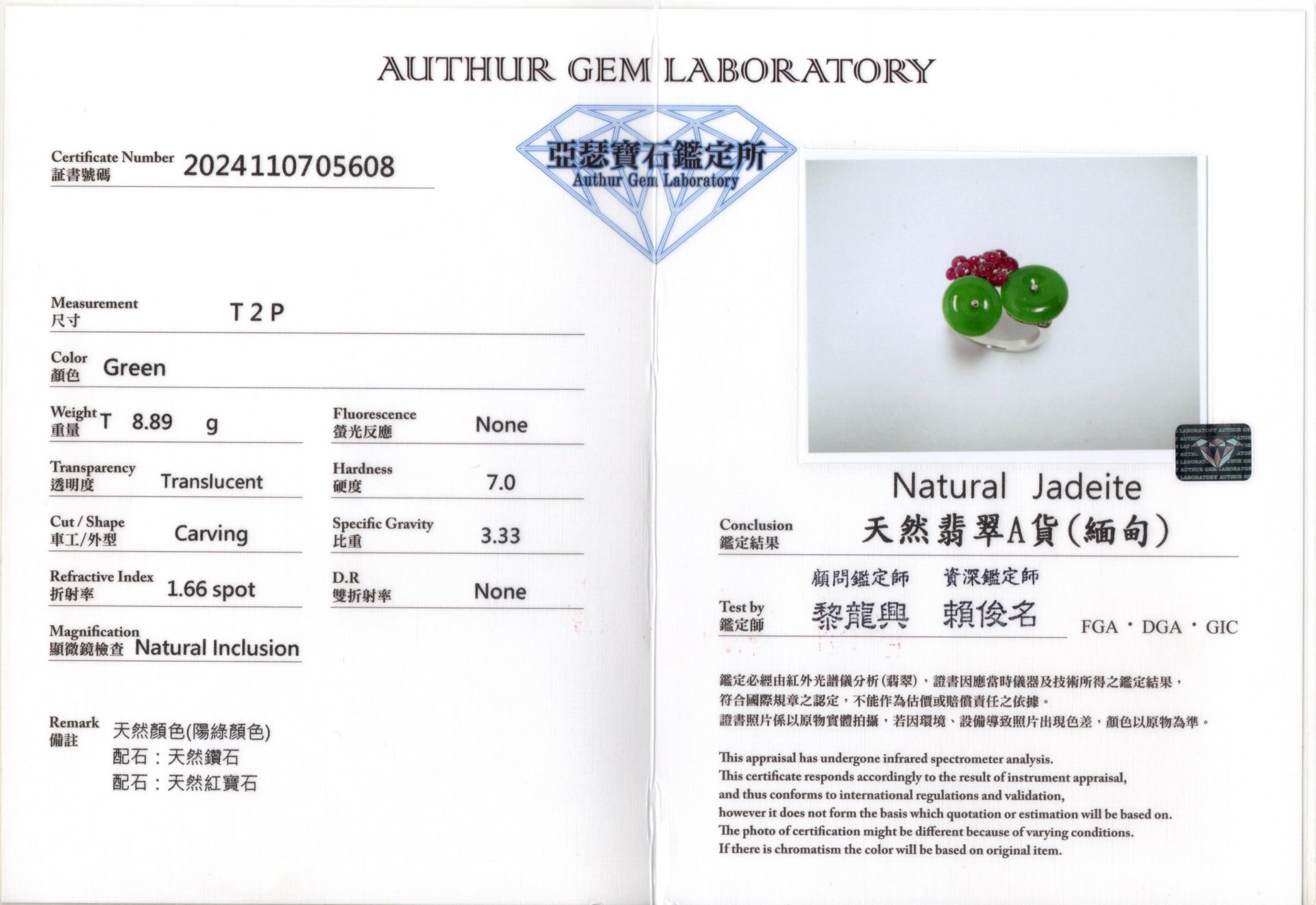 亞瑟寶石鑑定書(開新視窗)