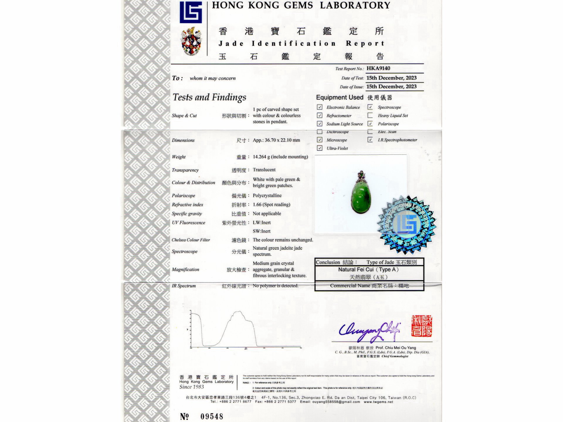 歐陽秋眉香港寶石鑑定所證書:冰種