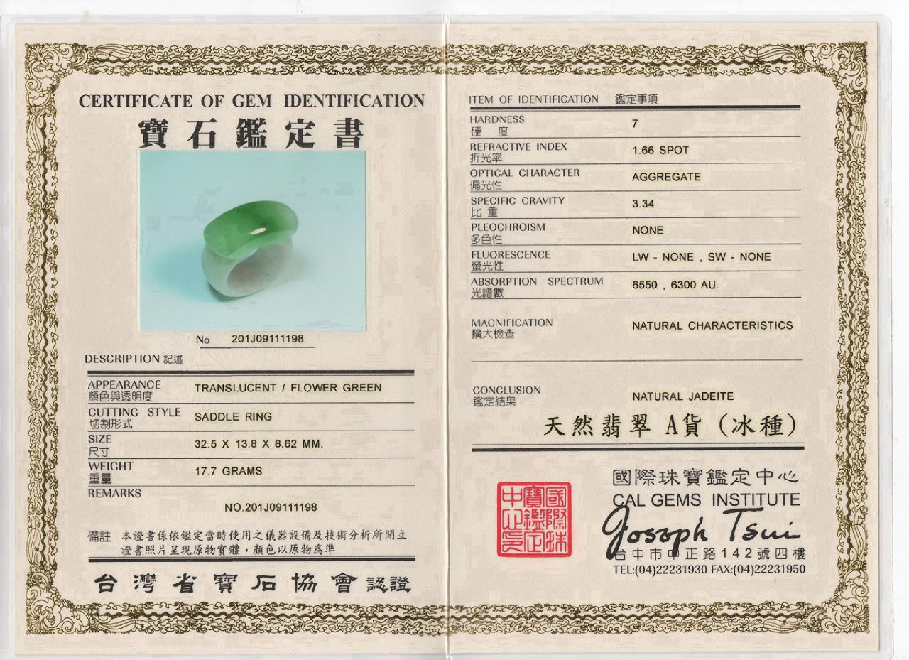 翡翠有玉石之王的美譽,是玉石中的硬玉類,其化學成分是鈉鋁矽酸鹽,礦物成分是以硬玉為主的輝石類,結構是由無數細小的纖維狀微晶縱橫交織而成的緻密塊狀集合體,具有毯狀構造。十分堅韌,能耐相當高的撞擊力和壓力,其製品經久耐用。翡翠的硬度為摩氏6.5-7 ,比重3.3 ,玻璃光澤或珍珠光澤,常呈半透明,少數為透明(全透明的稱“玻璃件”),斷口參差狀。在我國寶玉石界素有黃為翡,綠為翠的說法。