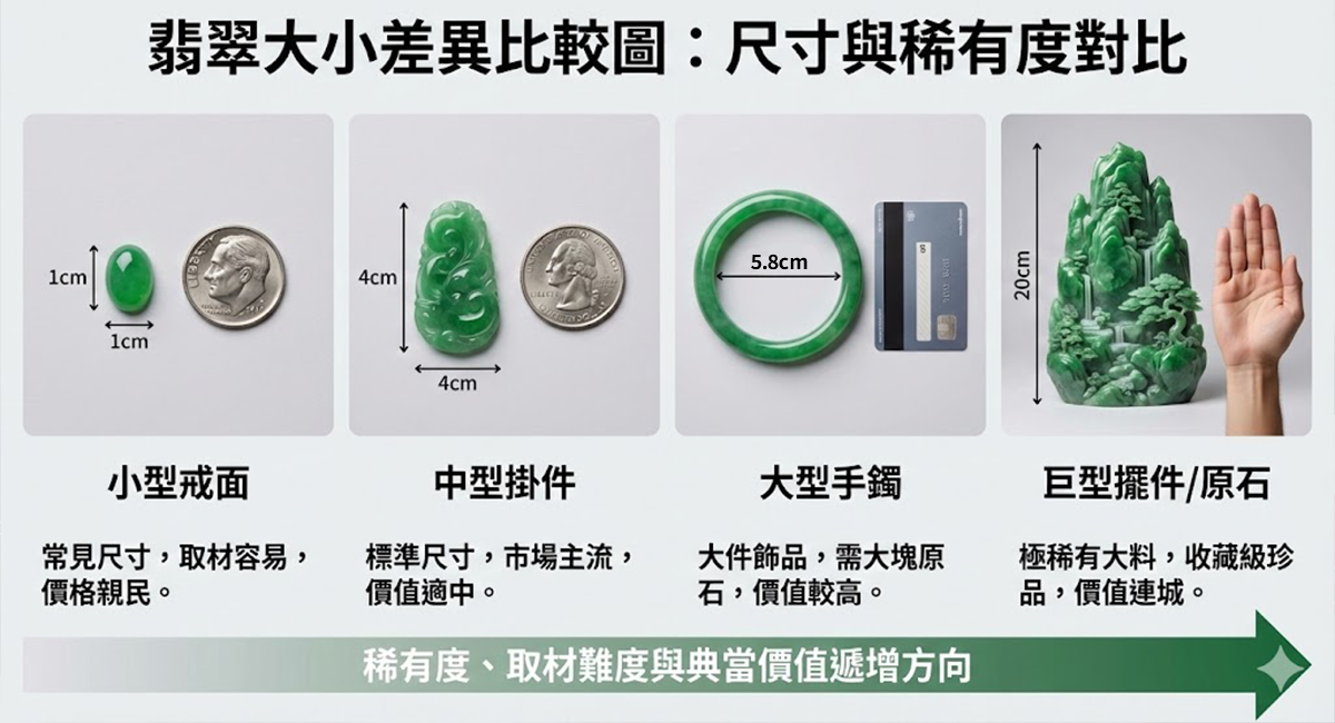 在寶石界,尺寸即是稀有度,翡翠的尺寸越大,往往代表在原石切割過程中保留了完整的精華部分,因此價值往往越高,尺寸對於價值的影響,主要體現在以下層面:
