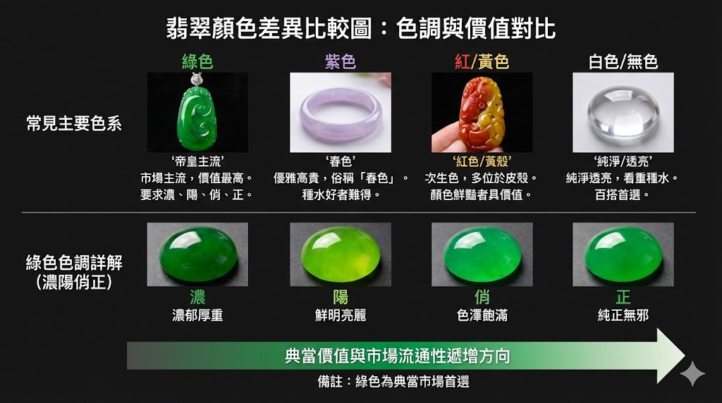 雖然翡翠也有紫羅蘭、紅翡等顏色,但在變現市場上,綠色的流通性與溢價空間始終穩居龍頭地位。