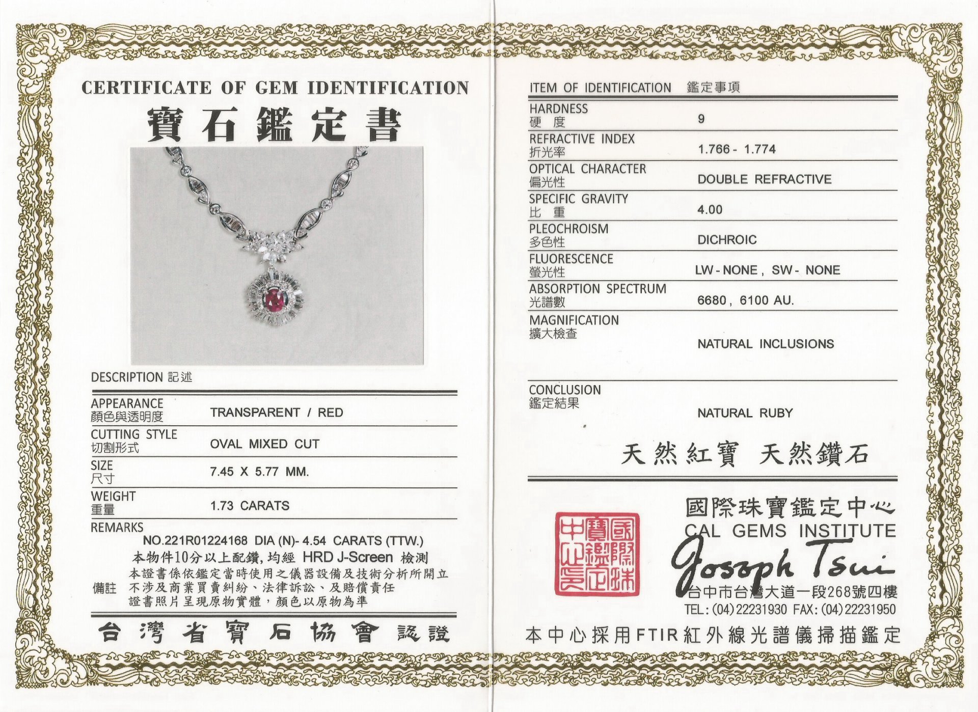 亞瑟寶石鑑定書(開新視窗)