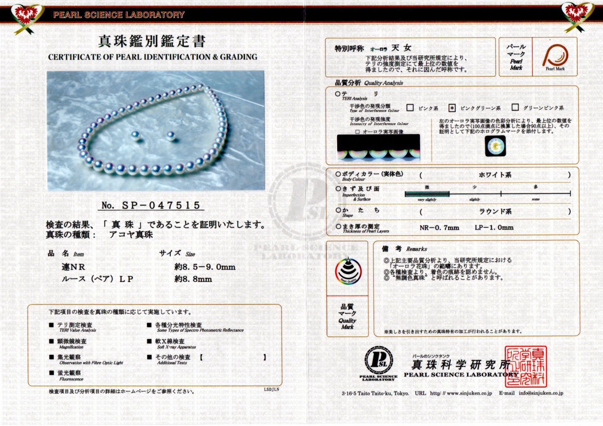 優質Akoya珍珠下半球會出現3種干涉色,即『極光效應』。擁有『極光效應』的Akoya珍珠且直徑在6mm以上的,才能命名為『極光天女』,簡稱『天女』。要得到一張由日本真珠科學研究所頒發的天女證書,必須通過重重嚴格把關。『天女』代表了白色系Akoya珍珠中的頂級存在。