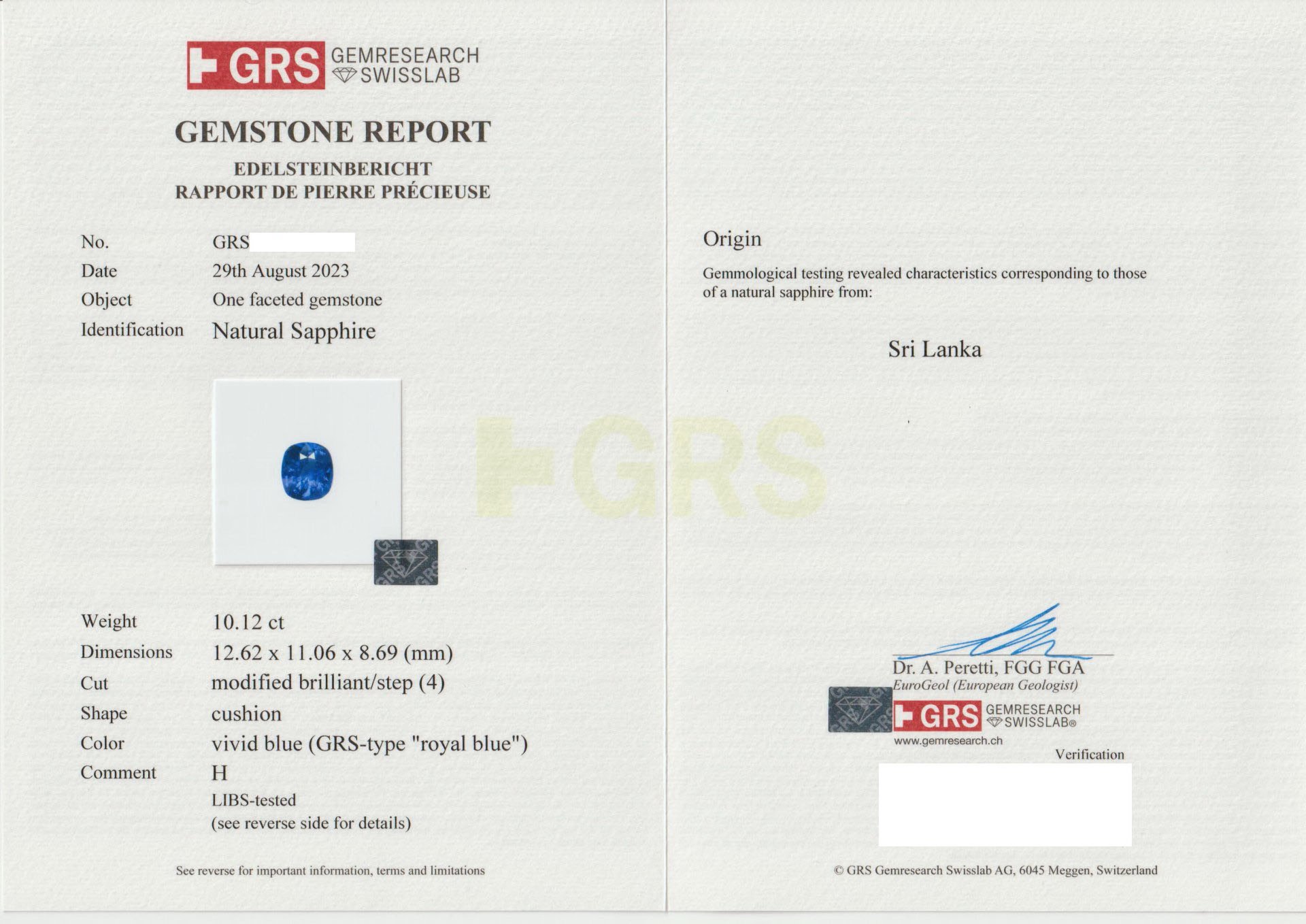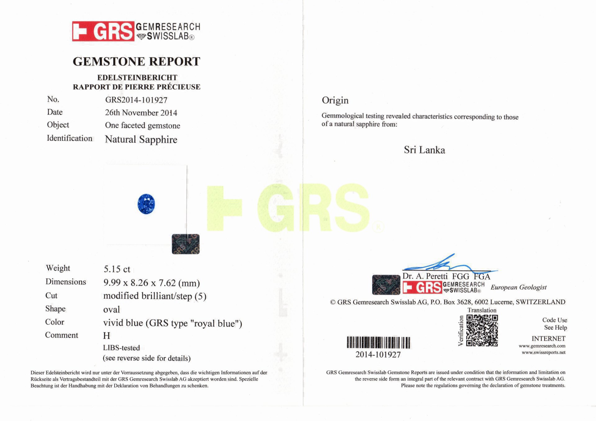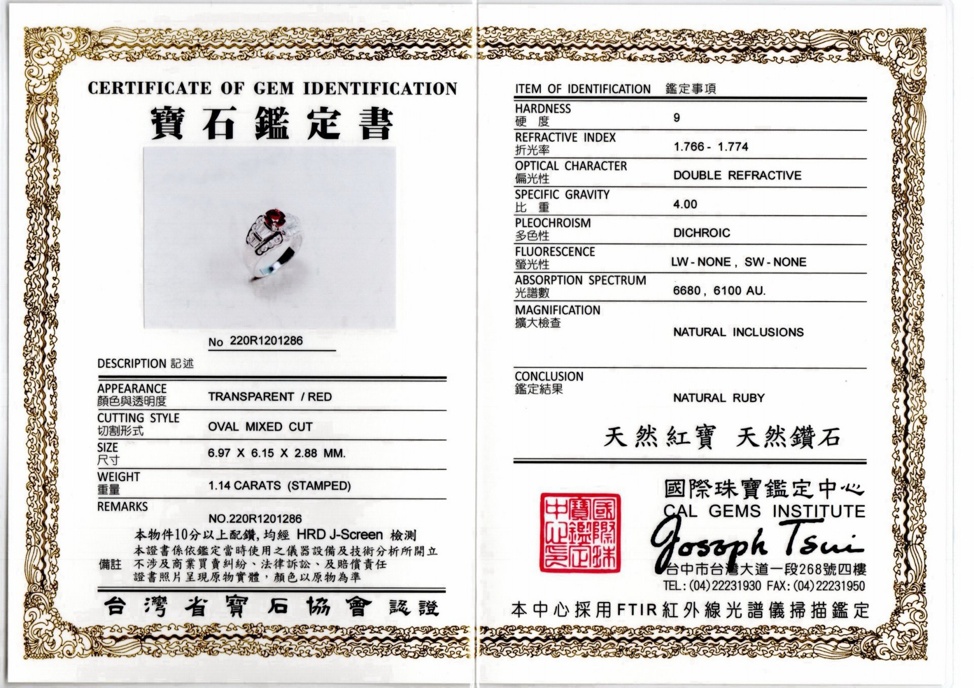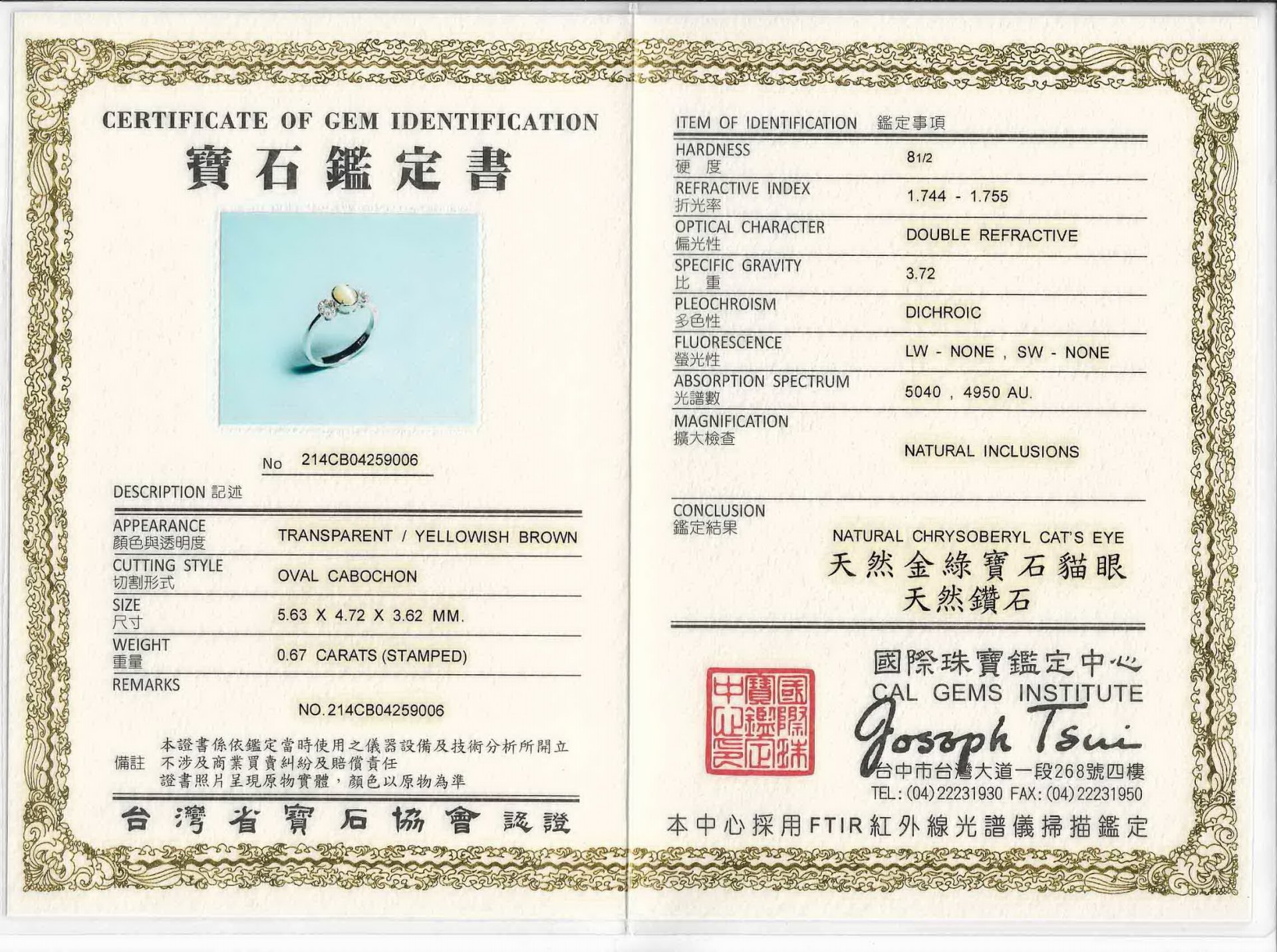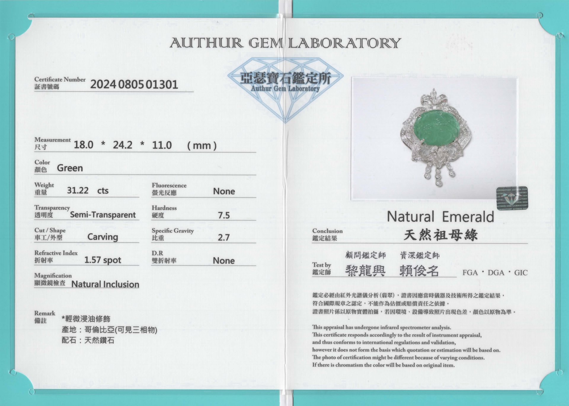亞瑟寶石鑑定書(開新視窗)