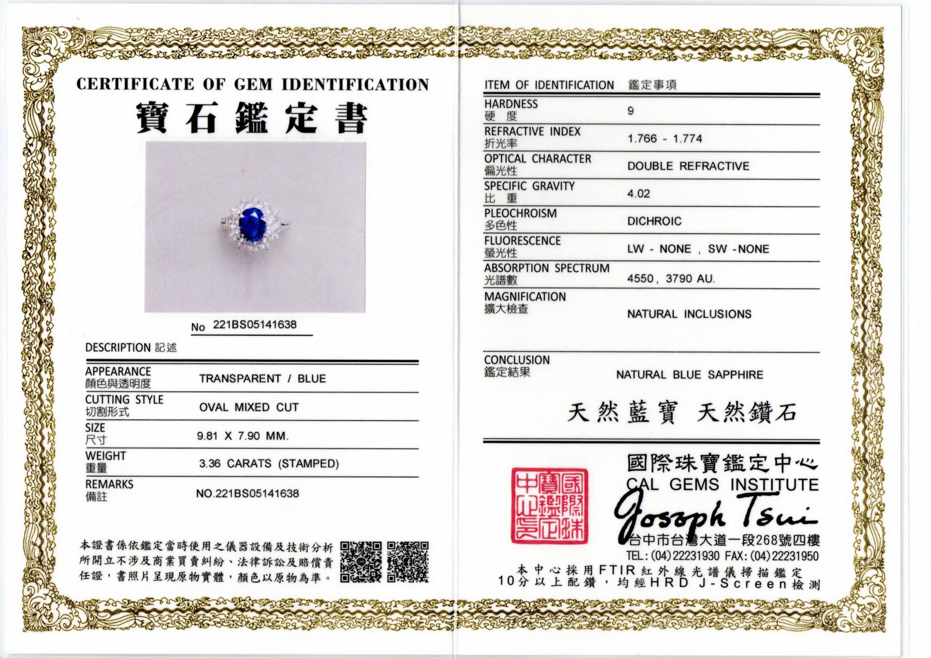 - 主石:天然藍寶 Unheat無燒 6.52ct