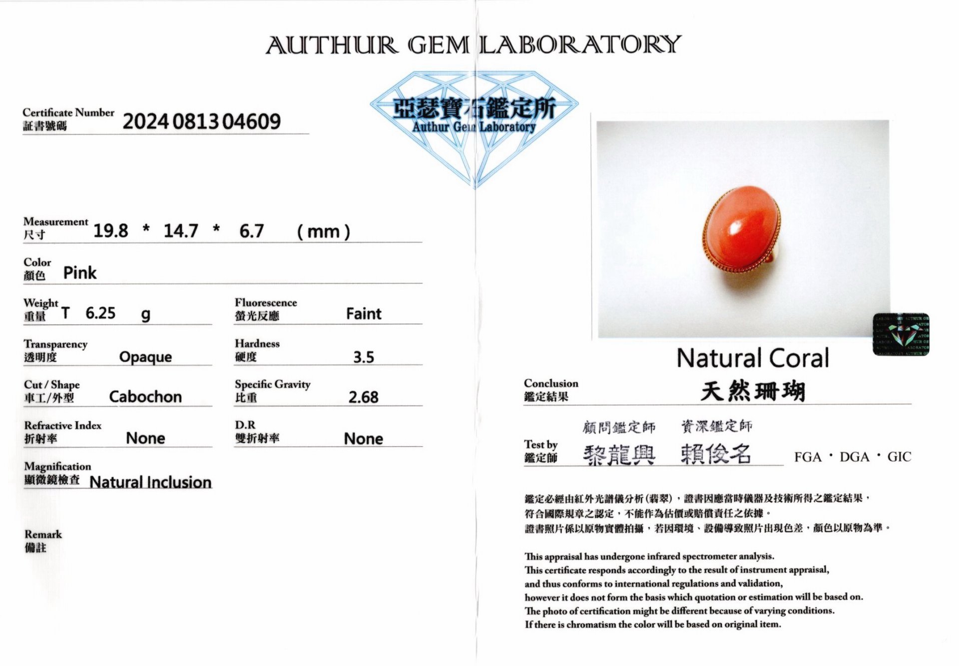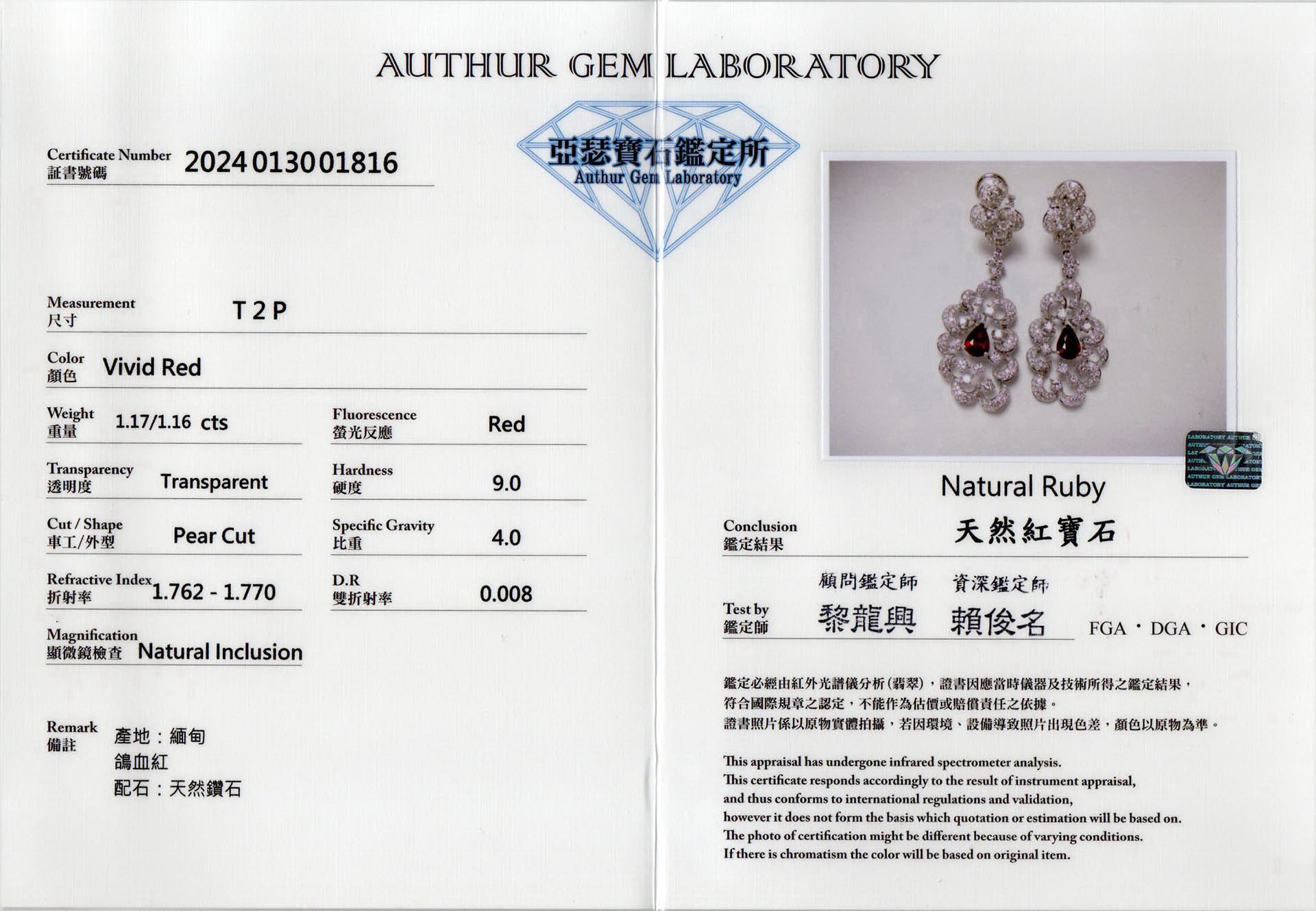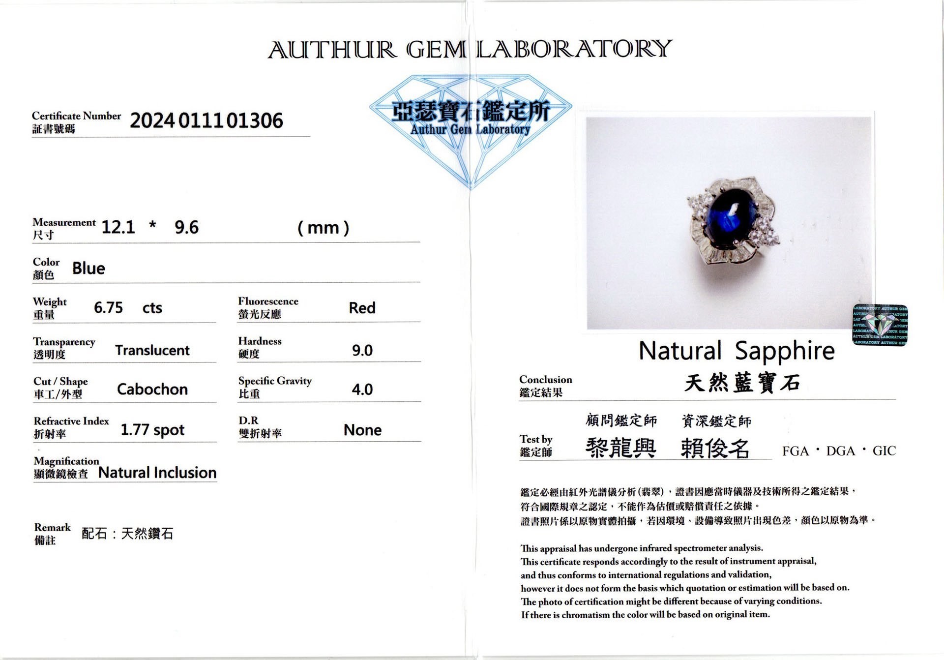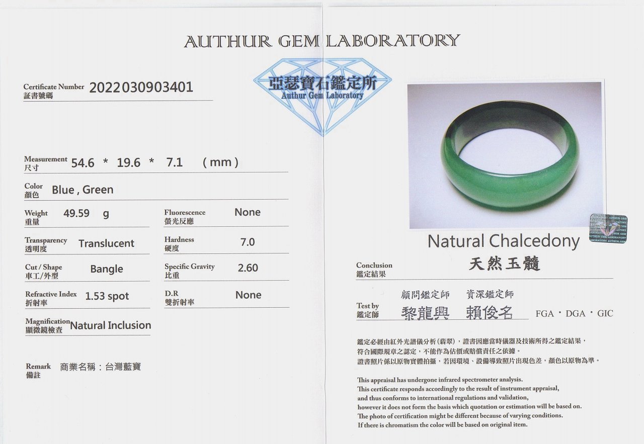 亞瑟寶石鑑定書(開新視窗)