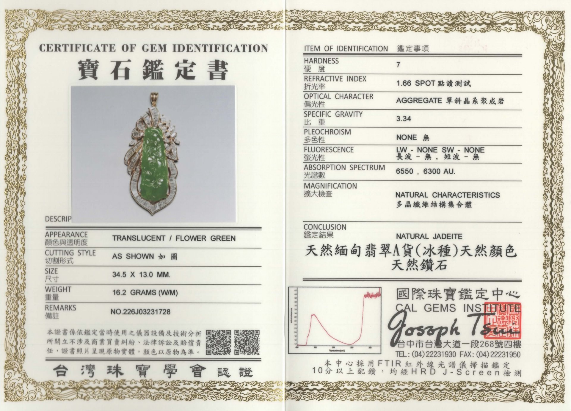 天然翡翠冰種飄蘭花,水頭通透,蘭花細緻宛如人間仙境,雕刻細膩雅緻,主石搭配30分美鑽,光配鑽就足足約有1.56克拉,豪華氣質又不失高雅。
