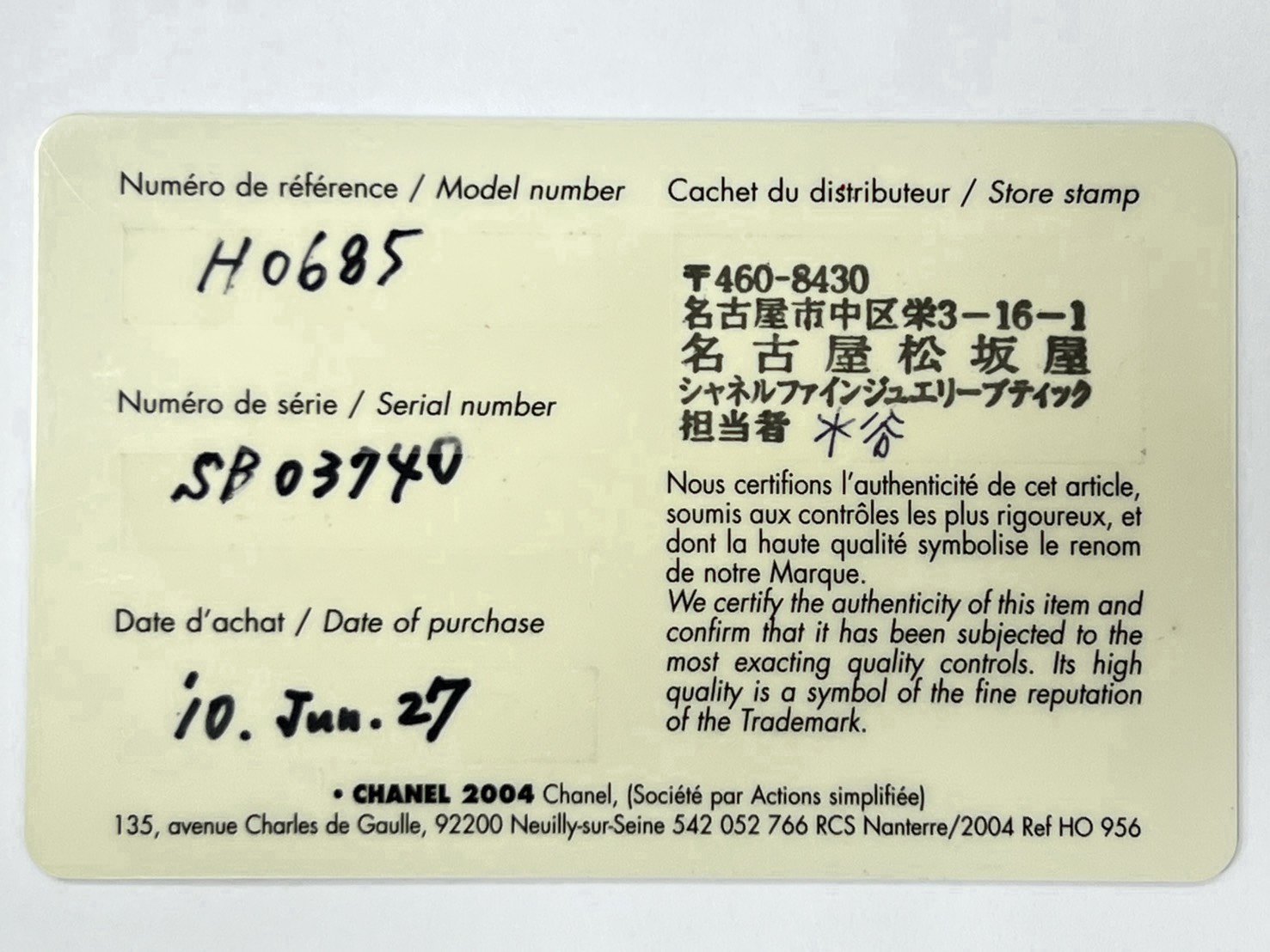 - 型式:CHANEL H0685 J12